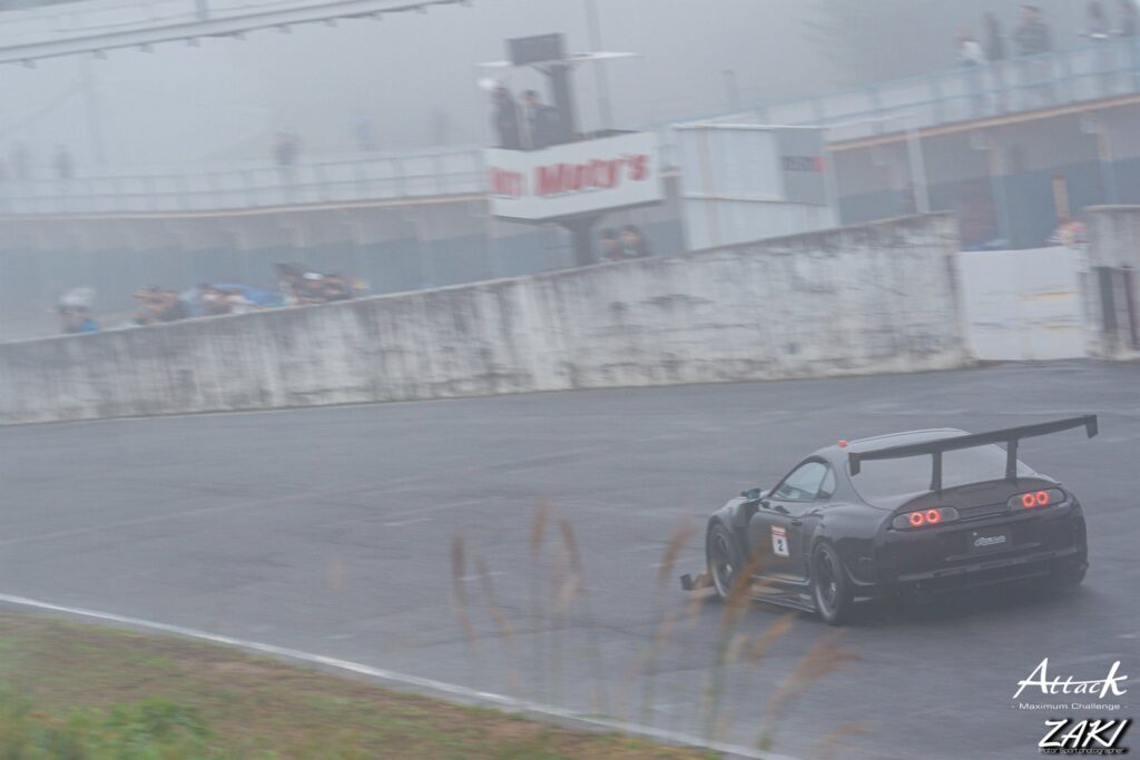 当日の天気は朝方まで曇りのドライ路面でしたが、走行直前から雨が降り始め、午前中は雨と霧による難しいコンディションに見舞われました。
