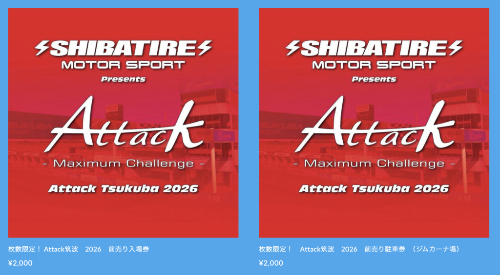「シバタイヤ presents Attack Tsukuba 2026」の前売り入場券およびジムカーナ場 駐車券の販売を開始いたしました!