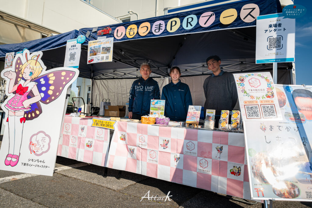 筑波サーキットを擁する下妻市がブースを出展。地域の魅力や特産品をPRしました。サーキットから約20分の場所にオープンした「ホテルルートイン下妻」も、遠征組には朗報です。