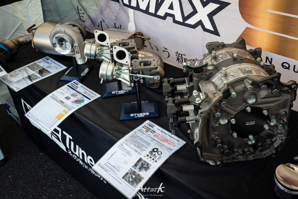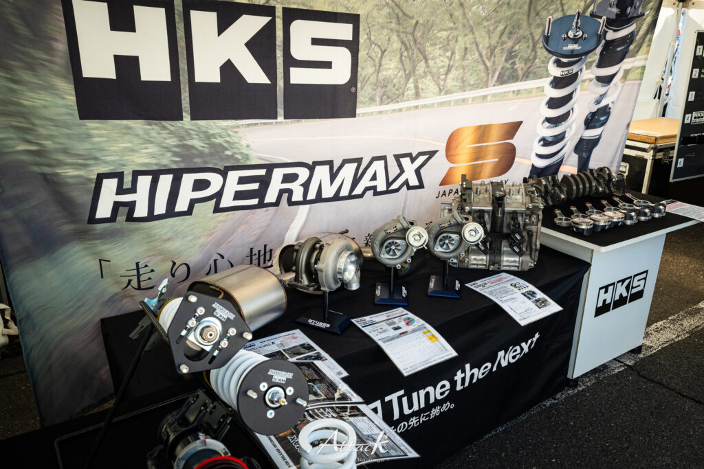 総合チューニングパーツメーカー「HKS」。エンジン、サスペンション、電子制御パーツなど幅広い製品を展示・販売しました。
