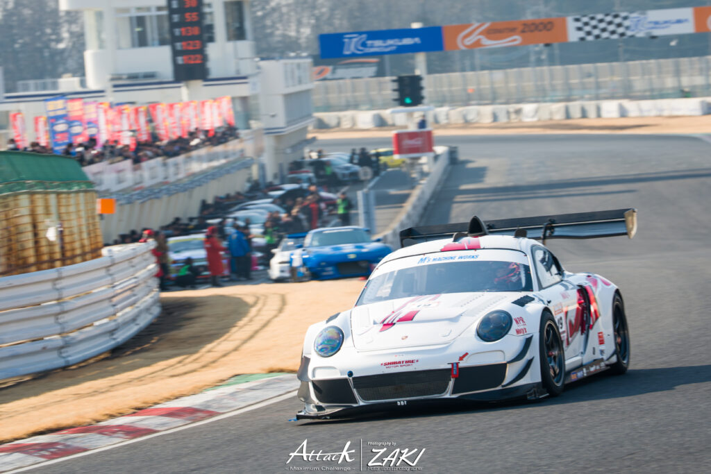 そしてそのNA最速の座を狙い、可変リアウイングDRSなどのアップデートを施して挑んだM’s Cayman GT3(上村優太選手)。NA最速を懸けた2台は同時コースインとなりました。