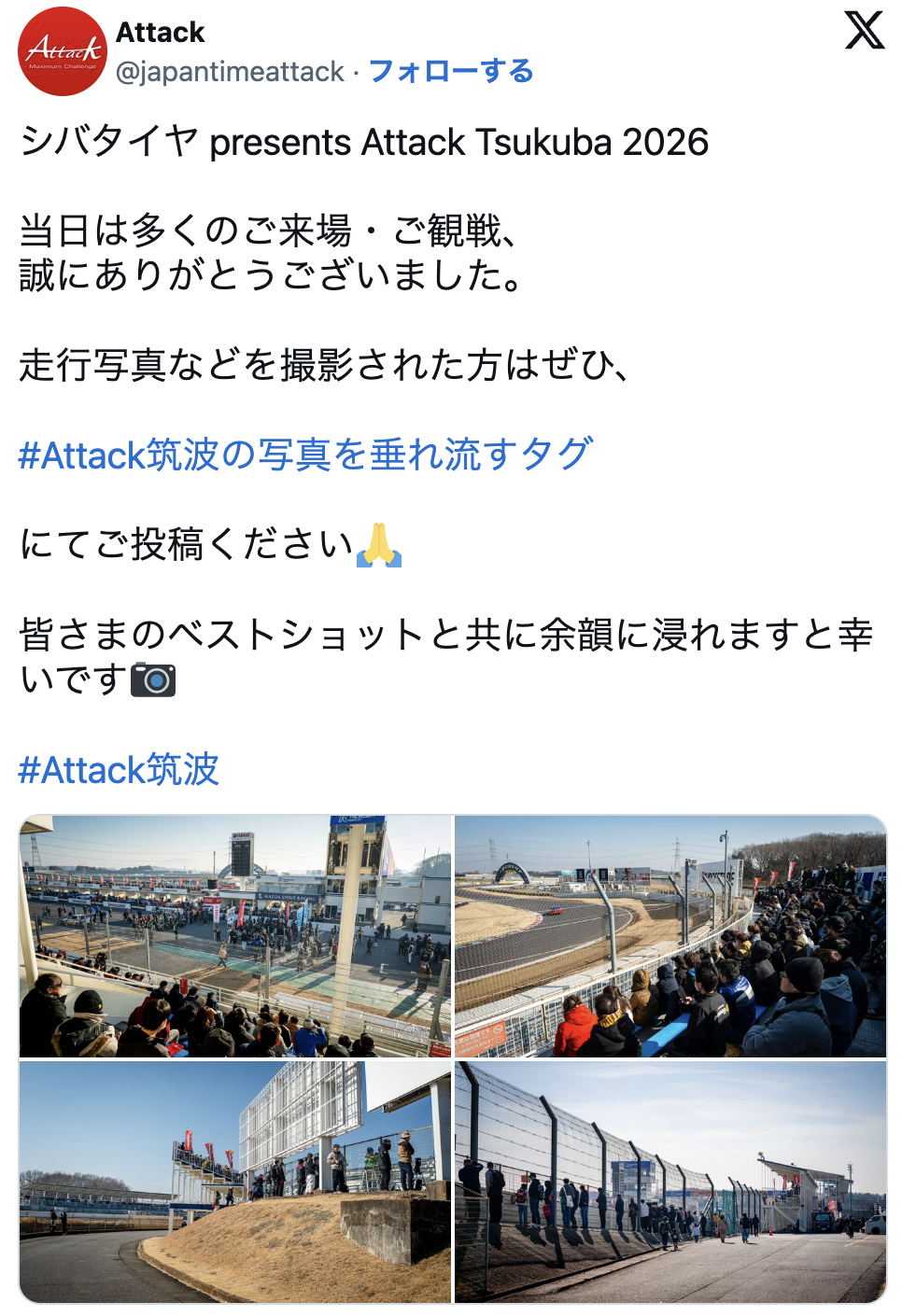 2026年2月14日(土)、筑波サーキット コース2000にて、チューニングカーによるタイムアタックイベント「シバタイヤ presents Attack Tsukuba 2026」が晴天のもと、無事開催されました。